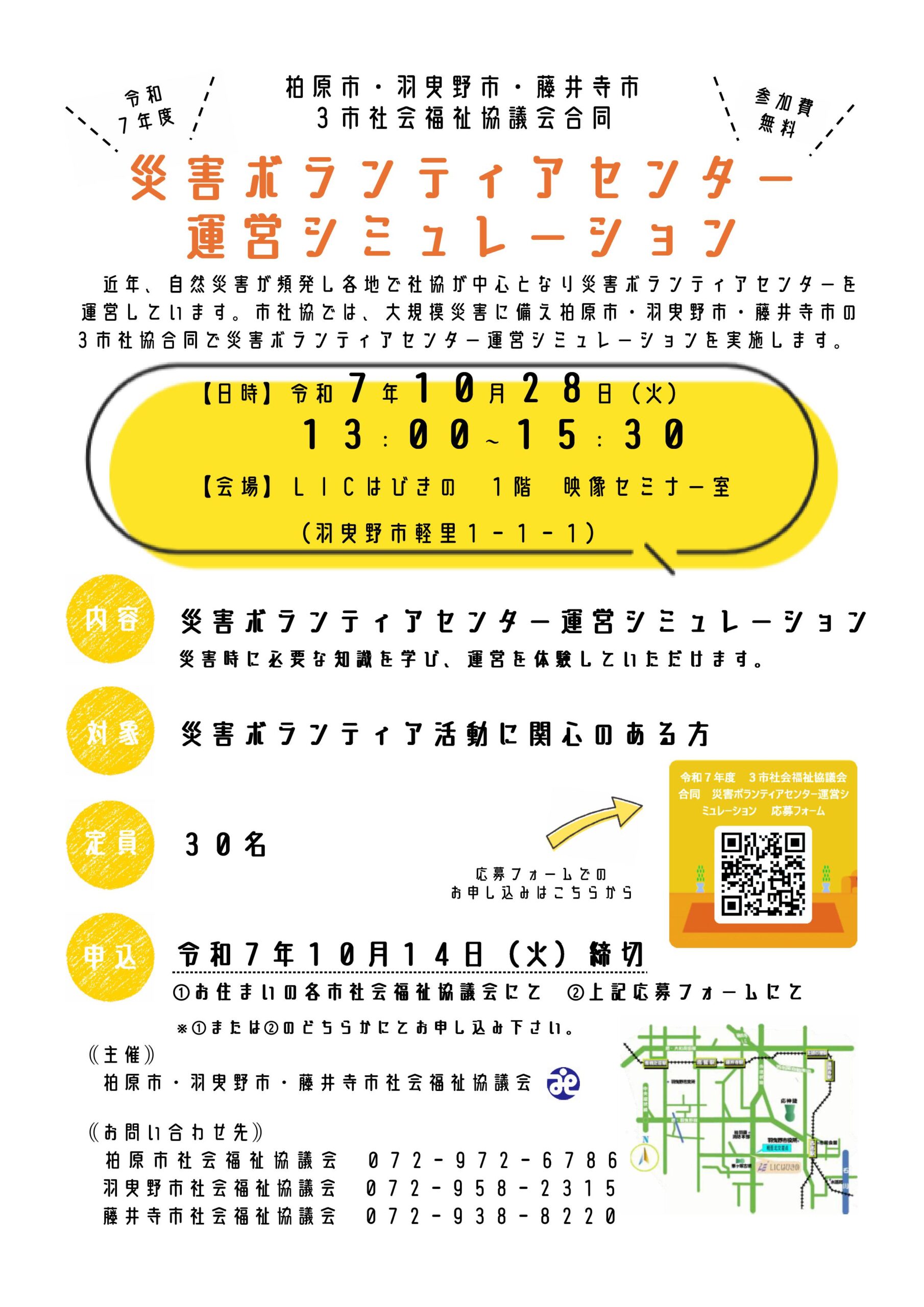 大規模災害に備え、柏原市・羽曳野市・藤井寺市の3市社協合同で、災害ボランティアセンター運営シミュレーションを実施します。